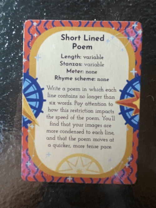 These cards sync up in a variety of ways—air travel, air as transitory space, the transitioning of space as you travel through it, etc. Whether your poem documents real or imaginary travel (alien spaceship, anyone?), use the short lines in your poem to keep up a sense of rapid pace.