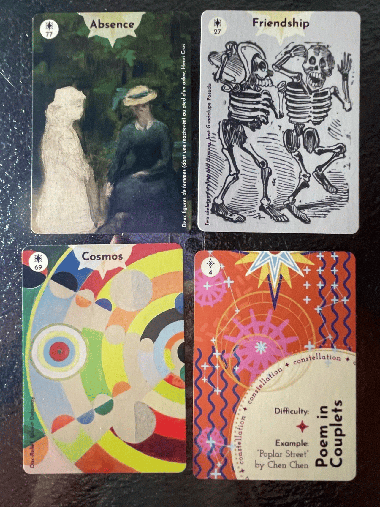The parallels between the Absence and Friendship cards are spooky when side by side. How can your poem create or fill an absence? What narrative arcs suggest themselves to you? Don't forget the cosmic background of the work! (But really, all friendships feel cosmic to me.)