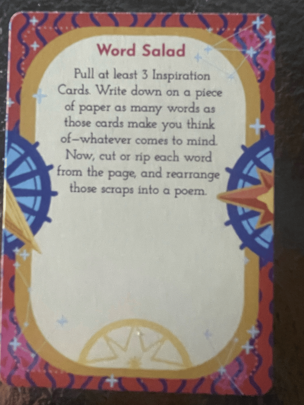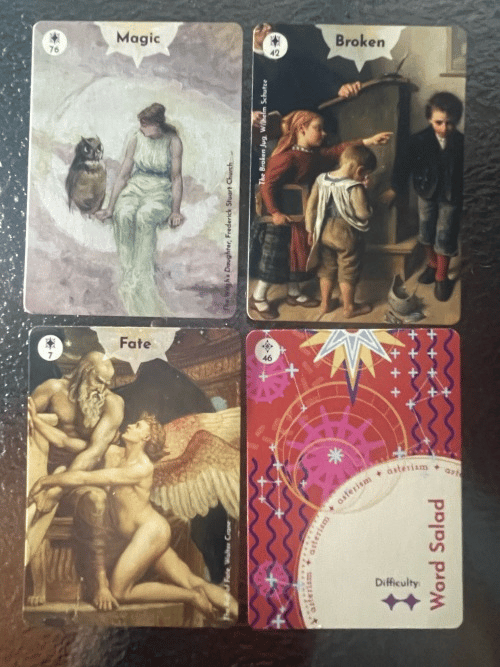 We pulled an asterism card! These form-related cards are more process-oriented than formal; they ask you to generate poetry in a unique way. Try your hand at this one, but if it doesn't suit you, feel free to write in a more traditional form.